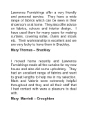 I moved home recently and Lawrence Furnishings made all the curtains for my new house and also did some upholstery. They had an excellent range of fabrics and went to great lengths to help me in my selection. Mark and Valerie were extremely helpful throughout and they and all their staff that I had contact with were a pleasure to deal with.