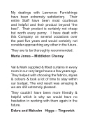 My dealings with Lawrence Furnishings have been extremely satisfactory. Their entire Staff have been most courteous and helpful and their product beyond “the best”. Their product is certainly not cheap but worth every penny. I have dealt with this Company on several occasions over the past five years and would certainly not consider approaching any other in the future.