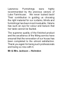 Lawrence Furnishings were highly recommended by the previous owners of Luke Farmhouse. We never looked back! Their contribution in guiding us choosing the right material for our curtains, blinds and furnishings has been most invaluable. Valerie has such an eye for colour and texture that her taste cannot be faulted.