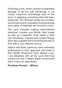 Following a Fire, which caused considerable damage to all the soft furnishings in my house, Lawrence Furnishings took on the work of replacing everything that had been destroyed. The finished results are excellent at all levels and the standard of workmanship and quality of materials are second to none.