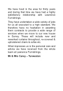 We have lived in the area for thirty years and during that time we have had a highly satisfactory relationship with Lawrence Furnishings.