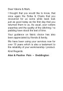 I thought that you would like to know, that once again the Sofas & Chairs that you recovered for us some while back look just as good today as the first day that you returned them to us. As usual, your cutters expertise and the quality of the stitching / re padding have stood the test of time.