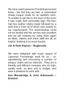 We have used Lawrence Furnishings several times - the first time we had a customised chaise longue made for an upstairs room. To enable to get this in the door of the room it was made with removable legs. We then had two leather chairs made followed by a sofa and a chair all of which was exactly to our requirements. The workmanship could not be faulted and the service was excellent and we will certainly be using them again as Mark, Valerie and there staff are all so helpful. Nothing is to much trouble.